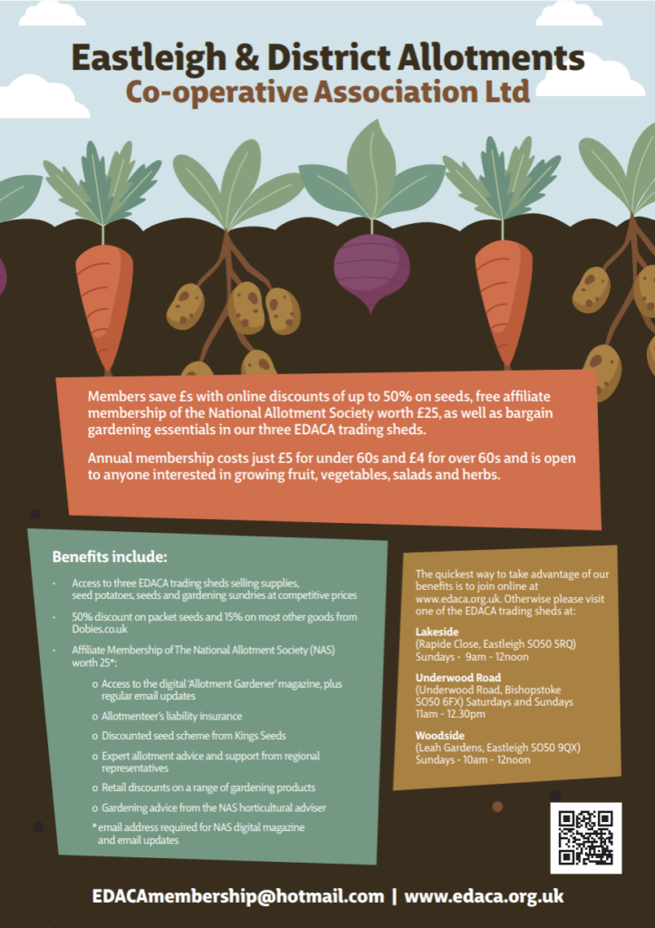 Members save £s with online discounts of up to 50% on seeds, free affiliate membership of the National Allotment Society worth £25, as well as bargain gardening essentials in our three EDACA trading sheds.